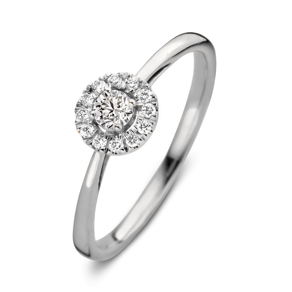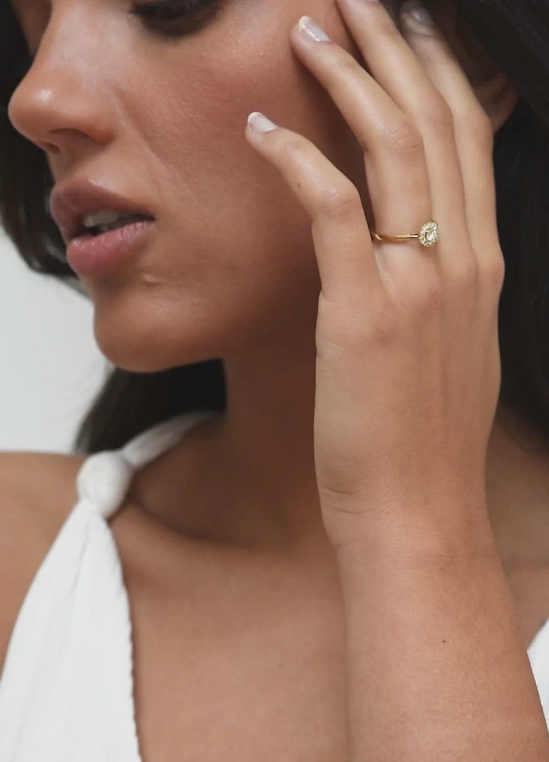 Dank seiner stilvollen und luxuriösen Erscheinung ist der Ring Emma eines unserer beliebtesten Ringmodelle. Der Ring hat eine wunderschöne Entourage-Fassung. Der runde Mittelstein (Brillantschliff) ist von kleineren Brillanten umgeben. Der Ring hat eine anmutige erhabene Fassung, sodass er sich perfekt mit einem glatten Ring oder einem Ring mit Diamantreihen kombinieren lässt. Kombinieren Sie ihn beispielsweise mit dem edlen Millie Ring .