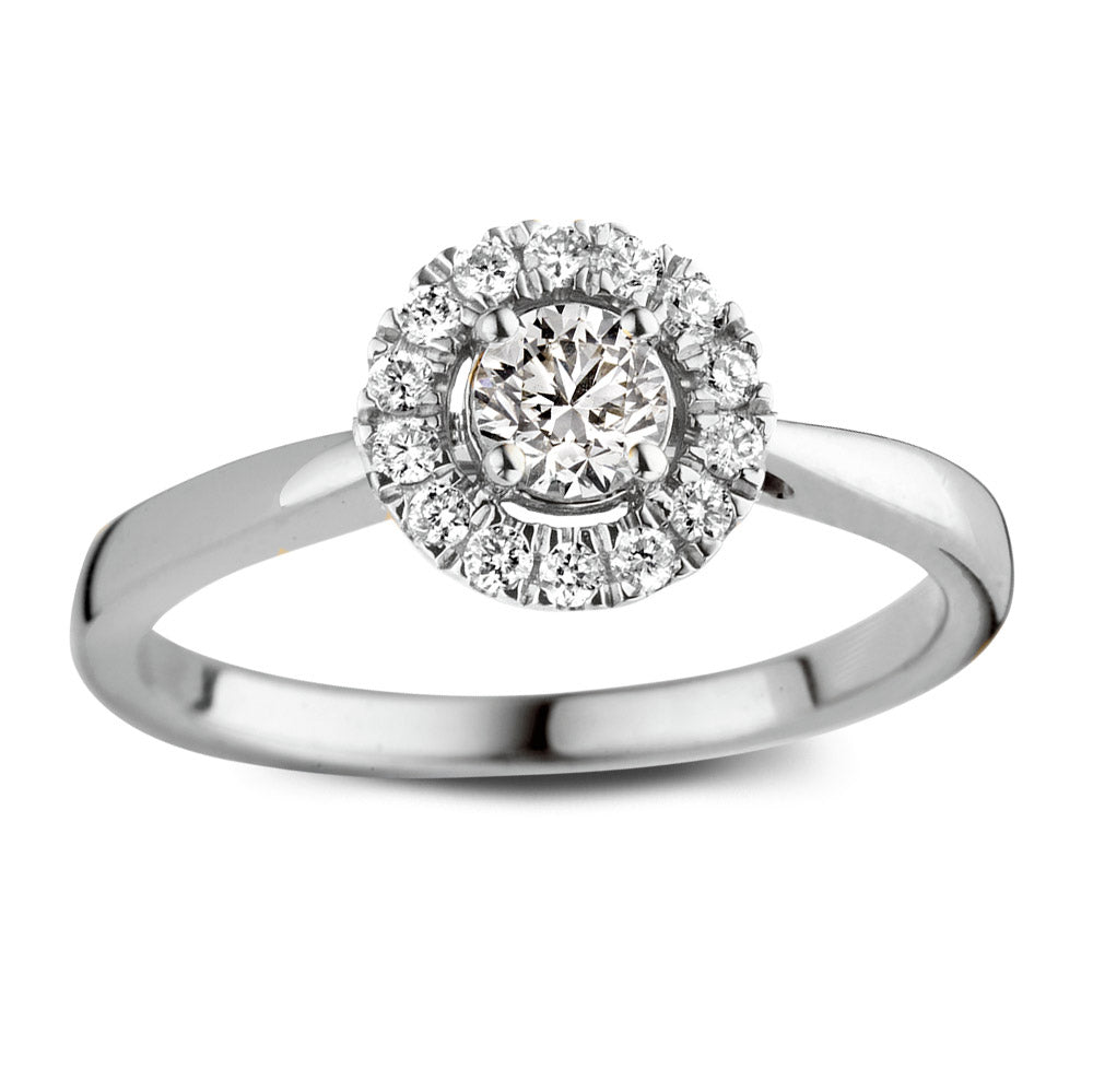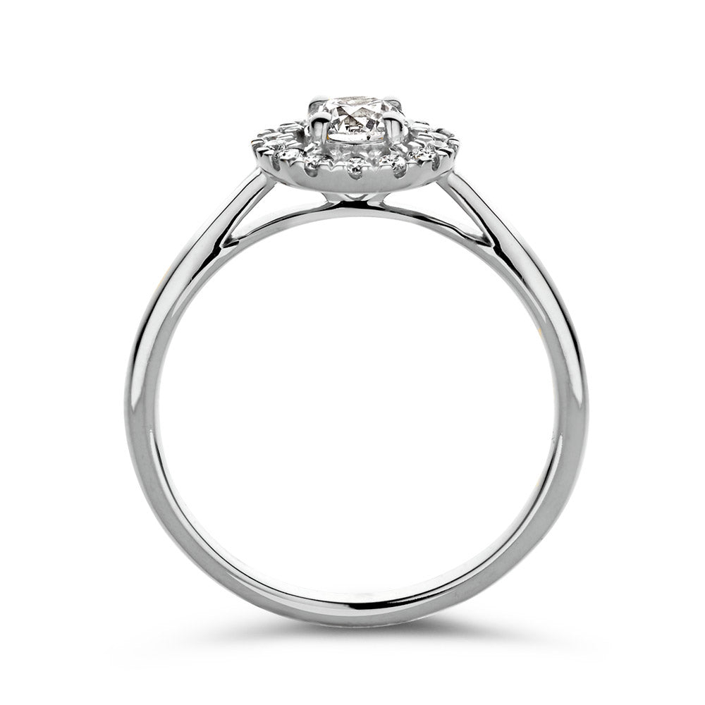 Dank seiner stilvollen und luxuriösen Erscheinung ist der Ring Emma eines unserer beliebtesten Ringmodelle. Der Ring hat eine wunderschöne Entourage-Fassung. Der runde Mittelstein (Brillantschliff) ist von kleineren Brillanten umgeben. Der Ring hat eine anmutige erhabene Fassung, sodass er sich perfekt mit einem glatten Ring oder einem Ring mit Diamantreihen kombinieren lässt. Kombinieren Sie ihn beispielsweise mit dem edlen Millie Ring .