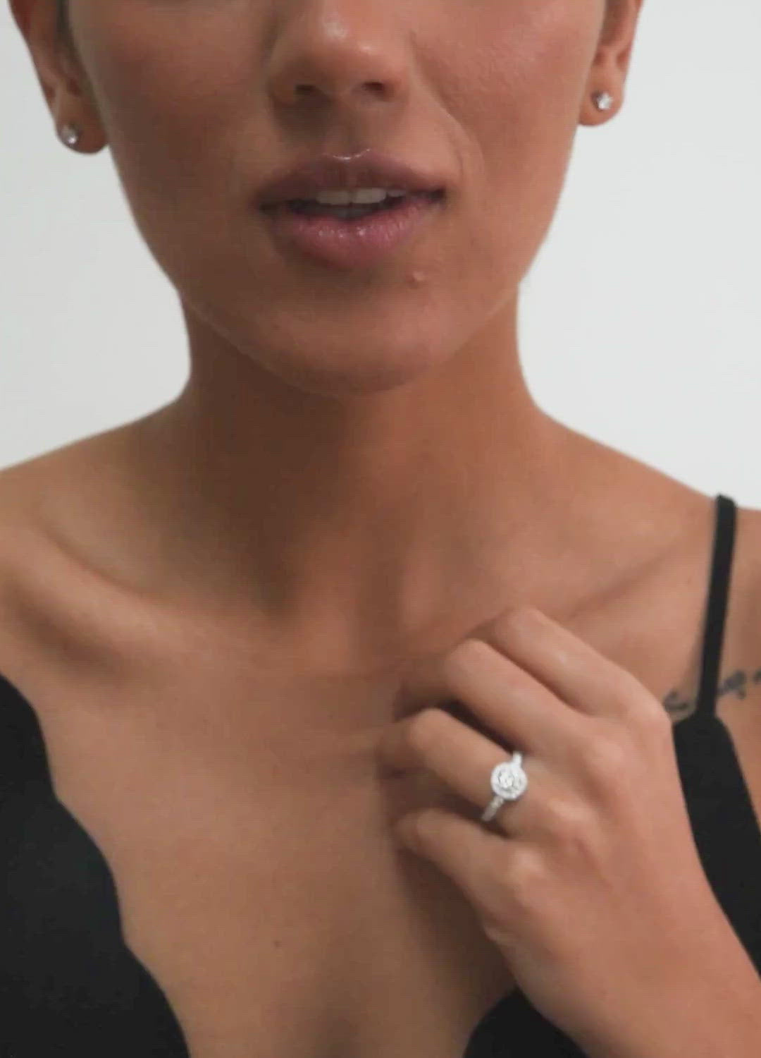 Dank seiner stilvollen und luxuriösen Erscheinung ist der Ring Emma eines unserer beliebtesten Ringmodelle. Der Ring hat eine wunderschöne Entourage-Fassung. Der runde Mittelstein (Brillantschliff) ist von kleineren Brillanten umgeben. Die seitlichen Steine ​​im Schienbein runden das Bild dieses luxuriösen Rings ab! Der Ring hat eine anmutige erhabene Fassung, sodass er sich perfekt mit einem glatten Ring oder einem Ring mit Diamantreihen kombinieren lässt. Kombinieren Sie ihn beispielsweise mit dem edlen Millie-Ring.