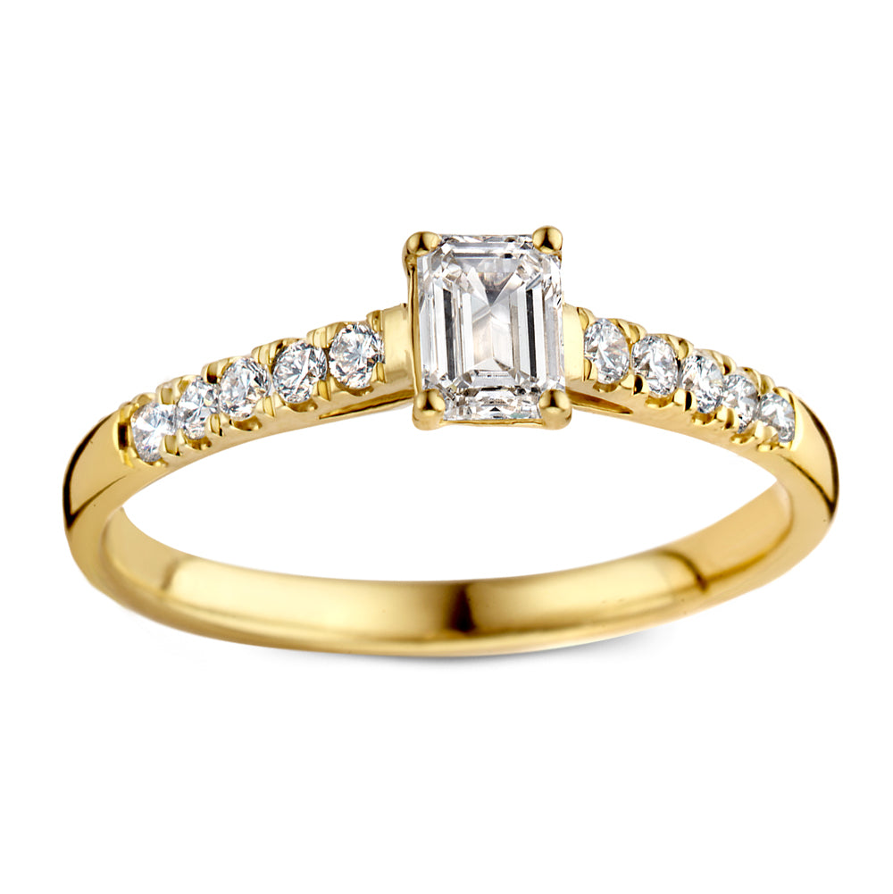 Der Ring Nora Royal ist ein besonderer und eleganter Solitärring mit Seitensteinen. In der Nora-Kollektion ist der Diamant im Smaragdschliff das absolute Herzstück. Dieser Ring verfügt über einen Smaragddiamanten in einer Vierkrappenfassung. Die langen Facetten verleihen diesem Diamanten ein strahlendes Aussehen. Die Diamanten in der Ringschiene runden das stilvolle Design ab. Wählen Sie die gewünschte Steingröße Ihres Diamanten selbst aus. Der wunderschöne Ring Nora ist in verschiedenen Größen und Goldfarben erhältlich.