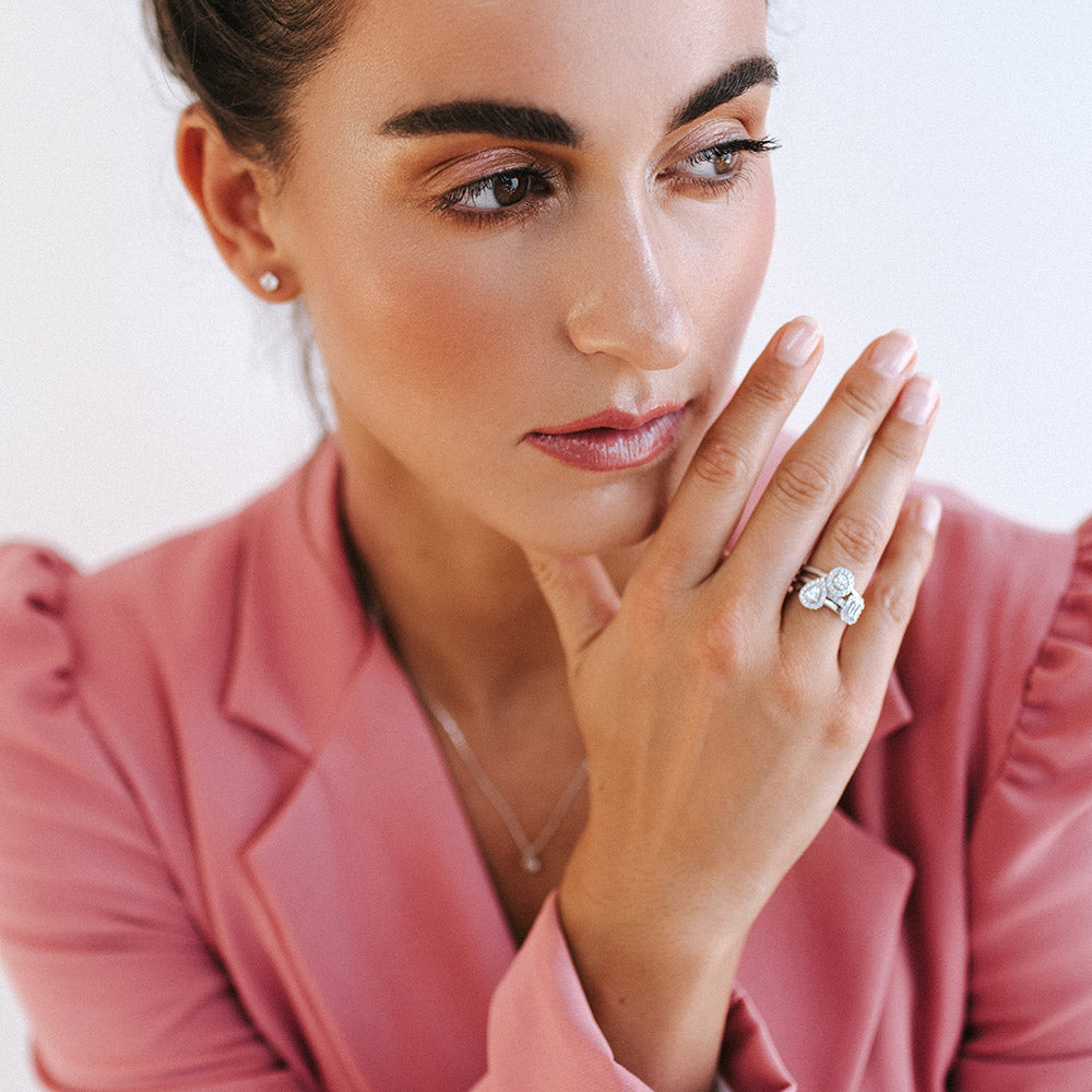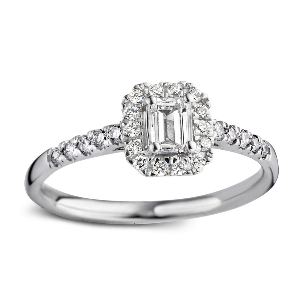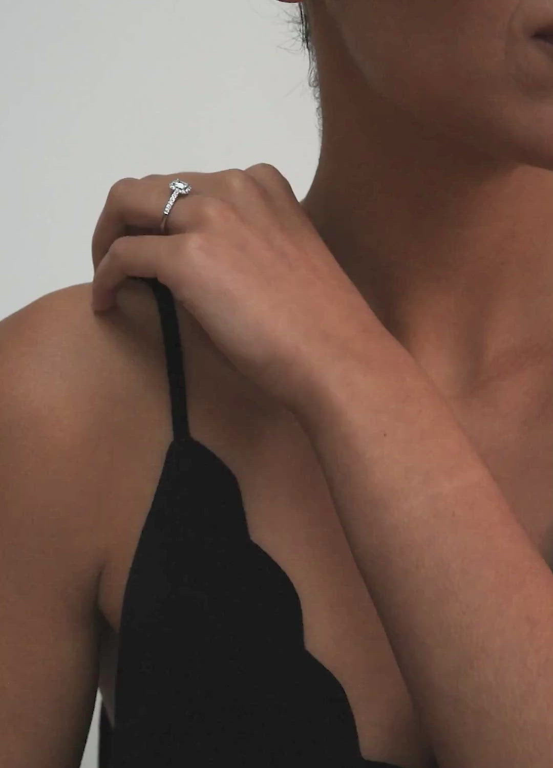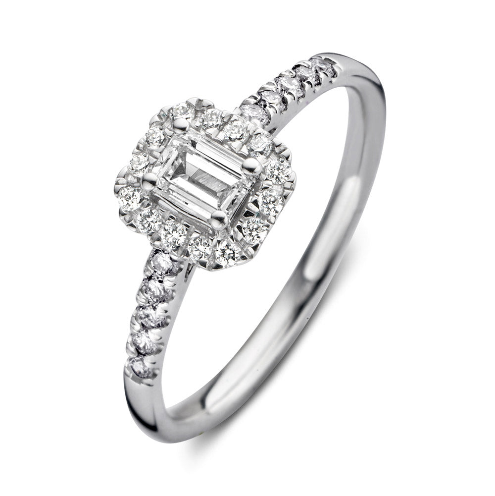 Der Ring Ivy Royal ist dank des wunderschönen Mittelsteins im Smaragdschliff ein echter Hingucker! Der markante Mittelstein ist von feinen Brillanten umgeben, die für ein besonders luxuriöses Aussehen sorgen. Die zusätzlichen Diamanten im Ringschaft runden das Ganze ab. Der Ring verfügt über eine leicht erhabene Fassung und lässt sich daher perfekt mit einem glatten Ring oder einem Diamantreihenring kombinieren. Kombinieren Sie ihn beispielsweise mit dem edlen Millie Ring .