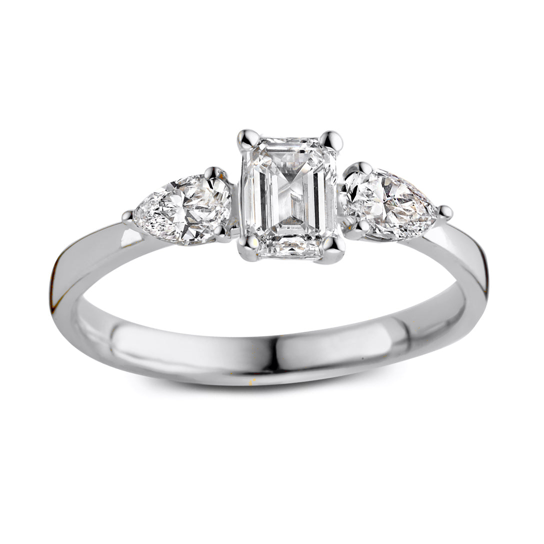 Ring Lize ist eine schöne Drei-Stein-Ring aus der Aurore-Kollektion . Die drei Diamanten symbolisieren „Vergangenheit, Gegenwart und Zukunft“ und sind ideal, um einen besonderen Moment im Leben zu feiern. Der Ring verfügt über einen auffälligen Diamanten im Smaragdschliff in einer vierzackigen Fassung aus klarem Weißgold. Zusätzlich sind auf beiden Seiten birnenförmige Diamanten eingearbeitet. Der stylische Lize Ring ist in verschiedenen Größen und Goldfarben erhältlich.