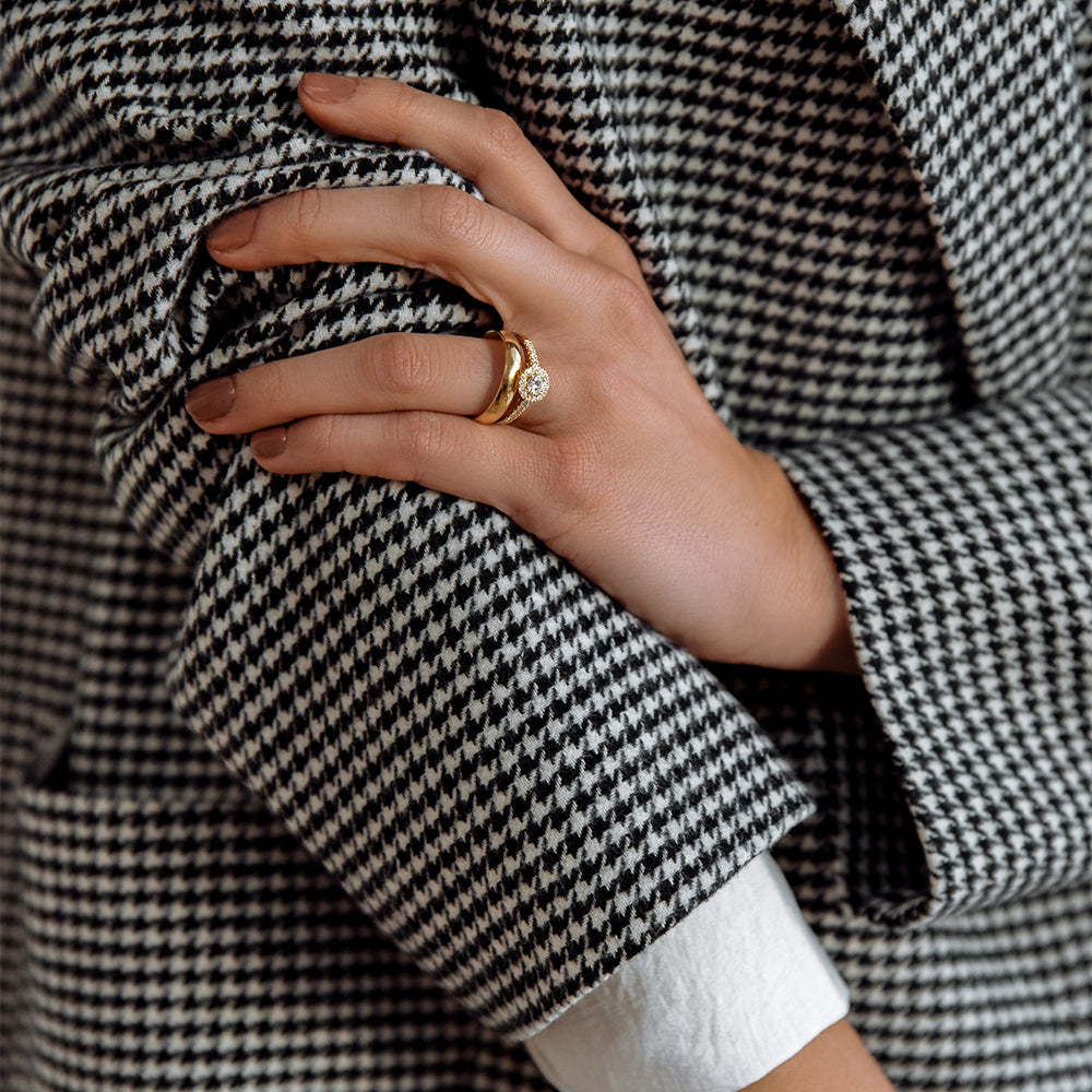 Natürlich komplett aus nachhaltigen Materialien hergestellt. Für die Eheringe verwenden wir ausschließlich 18 Karat Recyclinggold. Und alle Eheringe und Verlobungsringe lassen sich aufgrund ihrer Form perfekt mit den anderen Ringen der Aurore-Kollektion kombinieren.
