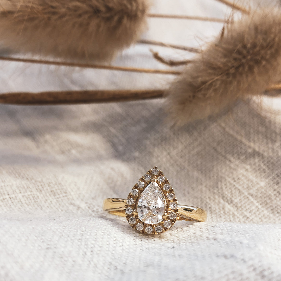 Ein weniger gebräuchlicher und daher auffälliger Schliff ist der birnenförmige Diamant. Sein Name kommt natürlich von seiner Birnenform, einer Kombination aus Brillant- und Marquiseschliff. Der birnenförmige Diamant optimiert außerdem die Karatzahl und lässt ihn größer erscheinen. Wussten Sie, dass der birnenförmige Diamant auch als Träne bezeichnet wird? Dieser Tränen der Freude- Diamant symbolisiert daher oft die Liebe und eignet sich perfekt für einen Verlobungsring.